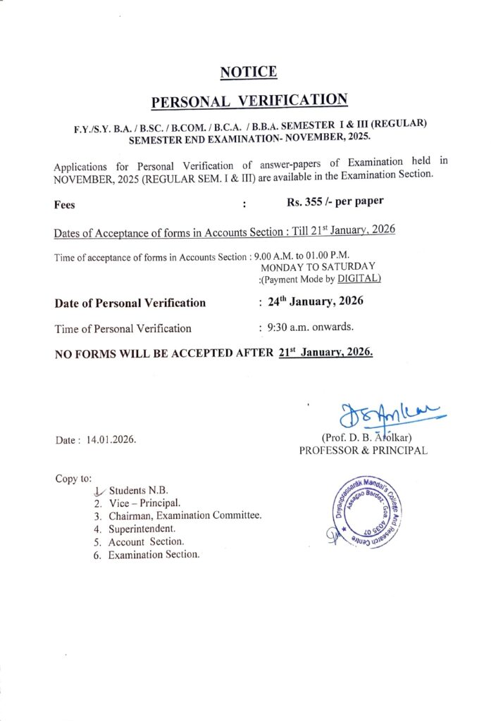 FY/SY BA/BSc/BCom/BCA/BBA Sem I/III (Regular) NEP Exam Nov 2025 Personal Verification – Notice